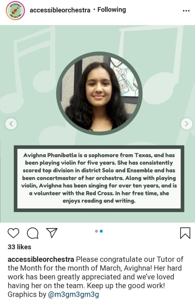 During my Sophomore year, I had an opportunity to teach Violin through Accessible Orchestra, an organization that strives to make music accessible for all people of all backgrounds. It gave me immense pleasure to be able to part my knowledge and help others upskill. The experience also thought me collaboration and Time management. I was named as Tutor of the month.